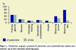 Ca. halvdelen af patienterne fandt, at de havde problemer med at overkomme praktiske gøremål i hverdagen. Dette resultat er i overensstemmelse med resultaterne i udenlandske undersøgelser [7, 11], hvor manglende evne til udføre vanlige gøremål [11] samt vanskeligheder med at udføre opgaver i hjemmet og indskrænkninger i fritidsaktiviteter [12] er hyppigt rapporterede problemer blandt kræftpatienter. Mens hovedparten af patienterne ikke havde væsentlige socioøkonomiske problemer, angav ca. en femtedel af patienterne dog, at sygdommen havde haft negative økonomiske konsekvenser for dem. Omtrent halvdelen af patienterne var tilknyttet arbejdsmarkedet, men problemer med arbejdsgiveren i forbindelse med sygdommen var sjældent rapporteret. Med hensyn til familien syntes patienterne først og fremmest at være belastet af den bekymring, som fremkom af, at deres sygdom påvirkede livskvaliteten hos partneren (47% af patienter i parforhold) og børnene (53% af patienter med hjemmeboende børn).