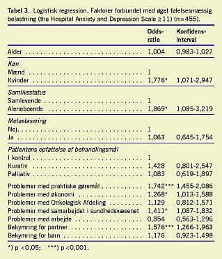 I analysen blev det påvist at kvinder og aleneboende patienter havde højest risiko for at rapportere følelsesmæssig belastning. Desuden var problemer med praktiske gøremål, økonomi, dårligt samarbejde mellem sundheds- og socialvæsen og bekymring for partneren prædiktive for følelsesmæssig belastning (Tabel 3).