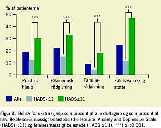Alle deltagere blev bedt om at angive, om de oplevede at have udækkede behov for hjælp. Inden for hhv. gruppen af patienter, som var følelsesmæssigt belastede (HADS ≥ 11), og gruppen af patienter, som ikke var følelsesmæssigt belastede (HADS < 11), var der forskelle i behovet for yderligere hjælp (Figur 2).