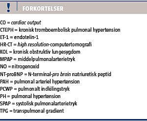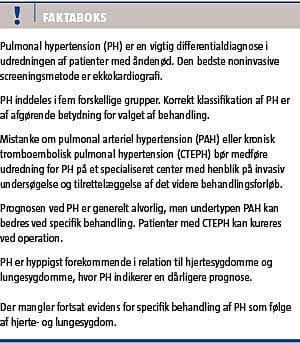 PH omfatter en heterogen gruppe af tilstande, der generelt har en alvorlig prognose. Man bør derfor være bevidst om PH som differentialdiagnose i udredningen af patienter med åndenød, hvor ekkokardiografi er den centrale screeningsundersøgelse. Findes der ved denne undersøgelse tegn på PH, skal undertypen bestemmes.