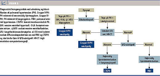 For kort at optegne den diagnostiske fremgangsmåde ved PH undersøges der for tegn på PH ved hjælp af ekkokardiografi og samtidig for venstresidig og medfødt hjertesygdom. Hvis der ved ekkokardiografi påvises PH uden andre patologiske kardielle fund, undersøges der for lungesygdom ved lungefunktionsundersøgelse, røntgen af thorax og eventuelt HR-CT. Viser disse undersøgelser heller ikke tegn på lungesygdom, udredes der yderligere. Centralt står nu undersøgelse for lungeemboli med ventilations-/perfusionsscintigrafi. Er resultatet af denne foreneligt med lungeemboli, bør diagnosen underbygges med CT-angiografi eller direkte selektiv lungeangiografi og højresidig hjertekateterisation (Figur 1).