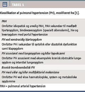 Pulmonal hypertension (PH) defineres ved et middelpulmonalarterietryk (MPAP) på ≥ 25 mmHg og klassificeres i fem grupper på baggrund af patofysiologi (Tabel 1) [2]. PH, der ikke har anden tilgrundliggende årsag eller er associeret med visse tilstande som for eksempel bindevævssygdomme (Tabel 1), betegnes pulmonal arteriel hypertension (PAH). Der kræves samtidig fravær af pulmonal venøs hypertension, dokumenteret ved et pulmonalt kapillært indkilingstryk (pulmonary capillary wedge pressure (PCWP)) < 15 mmHg. Er PCWP ≥ 15 mmHg, tilskrives PH venstresidig hjertesygdom [1].