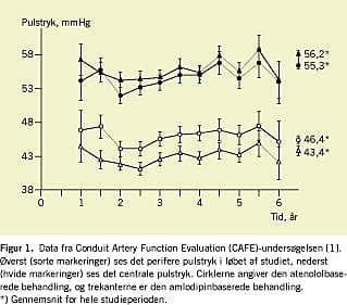 Senest har man interesseret sig for pulstrykket i de store centrale arterier. Dette tryk er ofte højt på trods af et normalt perifert blodtryk (målt på armen). I et nyligt publiceret substudie fra Scandinavian Cardiac Outcomes Trial-Blood Pressure Lowering Arm (ASCOT-BPLA)-undersøgelsen har man fokuseret på, om der var forskel på effekten på den centrale blodtryksreduktion afhængigt af, hvilken type blodtrykssænkende behandling man gav patienten. Her fandt man, at patienter behandlet med betablokkeren atenolol havde signifikant højere centralt pulstryk gennem hele studieperioden end de patienter, som fik en behandling baseret på calciumkanalblokkeren amlodipin (pulstryk atenolol 46,4 mmHg vs. amlodipin 43,4 mmHg p < 0,01) (Figur 1 ). Det var endvidere muligt at associere dette fund til antallet af kardiovaskulære hændelser i studiet [1].