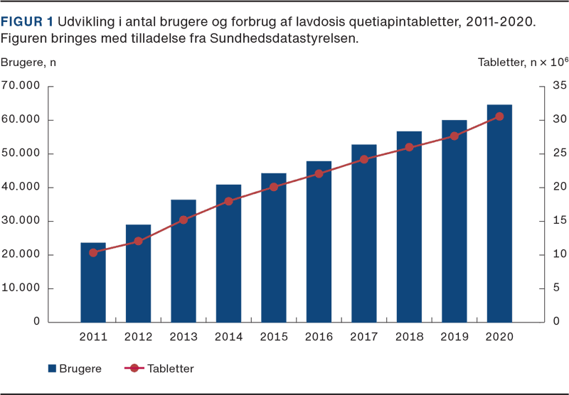 Behandling af emotionel ustabil personlighedsforstyrrelse med psykofarmaka er kontroversiel [1]. Quetiapin er et andengenerationsantipsykotikum, som bruges til behandling af skizofreni og bipolar lidelse. Dosis kan øges op til 1.200 mg/dag [2]. Quetiapins affinitet for forskellige receptorer afhænger af dosering, således at lavdosis (f.eks. 50 mg) medfører histamin-1-receptorblokade og sedation, mellemdosis (f.eks. 300 mg) giver en antidepressiv effekt igennem dopaminerge (D2) og serotonerge receptorer (5-HT2A, 5-HT2C og 5-HT1A), mens højdosis (f.eks. 800 mg) virker antipsykotisk. Præparatet anvendes i stort omfang til søvnforstyrrelser, angst, uro og affekttilstande og har fået en betydelig rolle i primærsektoren, se Figur 1.