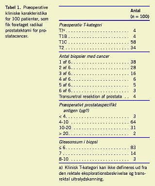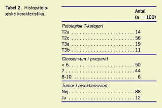 I opgørelsesperioden fra den 4. november 2004 til den 9. oktober 2006 var i alt 104 patienter indstillet til radikal prostatektomi pga. formodet lokaliseret PC. Fire patienter udgik, da man peroperativt ved frysemikroskopi af lymfeknuder fra fossa obturatoria opdagede, at de havde metastaser. Opgørelsen er således baseret på de resterende 100 patienter (67 patienter fra Ringkøbing Amt, 30 patienter fra Viborg Amt og 13 patienter henvist fra Skejby Sygehus), som fik foretaget radikal prostatektomi. Den mediane alder var 63 år (spændvidde: 56-72 år), og den mediane præoperative PSA var 8 μg/l (spændvidde: 1-24 μg/l). Tabel 1 viser de øvrige præoperative karakteristika. Den mediane operationstid var 85 minutter (spændvidde: 60-175 minutter). Den samlede mediane indlæggelsestid var seks dage (spændvidde: 5-23 dage). Histologisk havde 70 patienter lokaliseret prostatacancer i det endelige præparat og betragtes som makro- og mikroradikalt opererede (Tabel 2 ). To patienter (begge med T3b-sygdom) fik ved den endelige mikroskopi konstateret N1-sygdom.