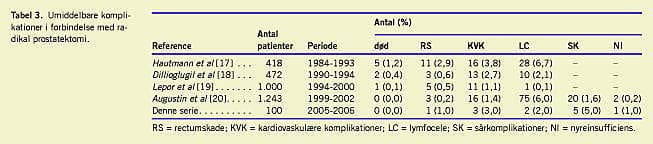 Ud over helbredelse for cancersygdommen, livskvalitet og langtidskomplikationer f.eks. i form af inkontinens og erektiv dysfunktion er forekomsten af per- og perioperative komplikationer et væsentligt måleresultat i forhold til den kirurgiske teknik og den perioperative behandling. Komplikationerne i denne opgørelse er opført i Tabel 3 og her sammenlignet med tal fra andre langt større patientserier. Med hensyn til morbiditeten synes resultaterne at være på niveau med resultaterne i de andre opgørelser, og som anført oplevede vi ikke dødsfald. De primære langtidsfølgevirkninger af radikal prostatektomi er urininkontinens og erektil dysfunktion. Hyppigheden af postoperativ inkontinens varierer fra 5% til 60% i forskellige opgørelser [12], og som anført i opgørelsen afspejler spredningen forskelle i patientselektion, definition, opfølgning samt metodologi og utvivlsomt også forskelle i kirurgisk teknik. Vore resultater synes at være på højde med resultaterne i en anden dansk opgørelse [1]. Vedrørende impotens har vi ikke specifikt haft mulighed for at opgøre dette, da patienterne ikke er vurderet efter samme retningslinjer. Alle er dog præoperativt informeret af kirurgen om de forskellige risici ved operationen, inklusive impotens. Denne undersøgelse af 100 konsekutive radikale prostatektomier udført som et samarbejde mellem to amtsurologiske afdelinger viser, at indgrebet kan udføres med stor sikkerhed og tilfredsstillende resultater.