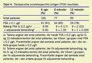 Opfølgningstiden var mediant 342 dage (spændvidde: 42-746 dage). Få patienter var helt kontinente (maksimalt dråbeinkontinens og i så begrænset omfang, at der ikke blev anvendt nogen form for beskyttelse) efter indgrebet ved seksugersopfølgningen, men ved seksmånederskontrollen havde 56 ud af 78 patienter fuld kontrol over vandladningen, og 18 havde dråbeinkontinens (maks. en Tena for men pr. døgn), mens fire havde lettere inkontinens (1-3 Tena for men pr. døgn). Af de 50 patienter, som havde været igennem etårskontrollen var 49 kontinente, og en havde svær stressinkontinens. Impotens (manglende evne til at kunne gennemføre coitus) er et betydeligt problem, idet stort set alle patienter fortsat var impotente ved opfølgningen. Biokemisk PSA-recidiv ved etårsopfølgning havde 11 ud af 50 patienter; ti patienter var begyndt på adjuverende hormonbehandling pga. postoperativt stigende PSA, mens en enkelt efter eget ønske var afventende (Tabel 4 ). Per- og perioperative komplikationer er anført i Tabel 3. I forbindelse med frigørelse af prostata opstod der en rectumlæsion, som blev lukket i to lag og behandlet med antibiotika i tre døgn. En patient fik umiddelbart postoperativt stort ektraperitonealt urinom pga. kataterproblemer, hvorfor han blev reopereret inden for første døgn. Herefter gik han i anuri og var efterfølgende tre gange i hæmodialyse hvorefter nyrefunktionen normaliseredes. Syv patienter fik senkomplikationer i form af ventralhernie (tre patienter) og anastomosestriktur (fire patienter).