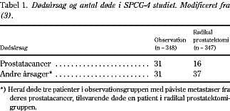 Med en median opfølgningstid på 6,2 år er den første analyse af undersøgelsen for nylig blevet publiceret (3). Undersøgelsen er den første af sin art; den er velgennemført, og resultaterne har vakt betydelig opmærksomhed i urologiske og onkolgiske kredse. I alt 695 evaluerbare patienter med en gennemsnitsalder på 64,7 år blev inkluderet, og det primære effektmål var prostatacancermortalitet. I alt 115 patienter var døde på opgørelsestidspunktet. Antal og årsager i de to arme fremgår af Tabel 1 . Med en komplet opfølgning af alle patienter og en analyse, der var baseret på intention-to-treat -princippet reducerede radikal prostatektomi risikoen for død af prostatacancer med 50% (95% sikkerhedsgrænser 9-83%; p = 0,02), og parallelt hermed reduceredes risikoen for at få metastatisk sygdom med 37% (95% sikkerhedsgrænser 4-59%; p = 0,03). Antallet af patienter, der senere blev hormonbehandlet (116 vs. 80), patienter med behov for pallierende strålebehandling (22 vs. 13) og patienter, der måtte underkastes laminektomi for spinalkompression (8 vs. 1), favoriserede radikal prostatektomi. I alt døde 62 mænd i observationsgruppen og 53 i den opererede gruppe af patienter. Denne forskel er ikke statistisk signifikant (p = 0,31).