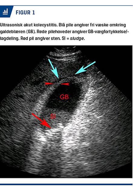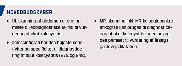 UL-skanning af abdomen er den primære billeddiagnostiske undersøgelse til diagnostik af AC [9]. Undersøgelsen er noninvasiv, hurtig at gennemføre og meget velegnet som førstevalgsundersøgelse. De vigtigste ultrasoniske fund er, fraset konkrementer, lagdeling af GB-væggen, GB-vægfortykkelse (≥ 5 mm), væske omkring GB [10] (Figur 1) samt en hyperæmisk væg ved undersøgelse med farve-Doppler [11]. UL-skanning har en sensitivitet på 81% og en specificitet på 83% for evaluering af patienter, hos hvem der er mistanke om AC [12], men det er ofte vanskeligt at påvise sten i de dybe galdeveje [8]. UL-visualisering af GB-sten har