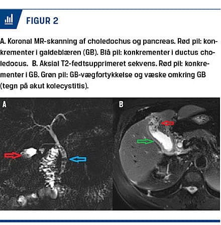 og kronisk kolecystitis samt GB-malignitet [19, 20]. MR-skanning-kolangiopankreatikografi (MRCP) har en højere sensitivitet end UL-skanning og CT i diagnostik af konkrementer i galdeveje [9]. Konkrementer påvises på T2-vægtede serier som et hypointenst fokus intraluminalt i GB og/eller galdeveje (Figur 2) [9].