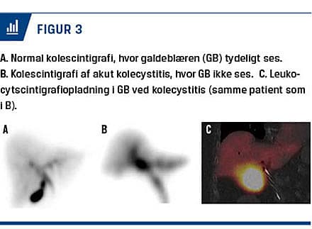 Kolescintigrafi er en funktionel dynamisk undersøgelse (Figur 3), hvor der intravenøst gives et radioaktivt sporstof (99mTc-mebrofenin (bromo-2,4,6-trimethylacetanilidoiminodiacetat) – Bridatec) [21]. I andre lande bruges andre 99mTc-mærkede iminodiacetatpræparater. Leverens ekstraktion af Bridatec er kun i meget ringe grad påvirket af leverfunktionen, og metoden kan dermed anvendes hos stort set alle patienter. Samtidigt med injektionen startes billedoptagelsen, der varer 90-120 minutter. Femogfyrre minutter efter injektionen af det radioaktive stof stimuleres GB med cholecystokinin (Sincalid) eller 250 ml piskefløde, hvorefter billedoptagelsen fortsætter i 45 minutter. Sincalid er et syntetisk cholecystokininprodukt, hvor de 8 C-terminale aminosyrer (octapeptid) anvendes. Leveren fjerner hurtigt det radioaktive sporstof fra cirkulationen, og i løbet af ti minutter er størstedelen af sporstoffet i leveren. Der er normalt sporstof i GB og ductus choledochus efter 20 minutter, og aktiviteten i GB er størst efter 30-45 minutter. GB stimuleres på dette tidspunkt med cholecystokininanalogen eller piskefløde. Foruden vurdering af afløbet til duodenum beregnes en uddrivningsfraktion af sporstoffet fra GB. Uddrivningsfraktionen skal være mindst 40% af indholdet i GB efter 45 minutter. Kolescintigrafi er med en sensitivitet på 97% og en specificitet på 94% stort set patognomonisk for AC. Hos patienter med AC ses ingen eller kun ringe opladning i GB [21]. Ved dyskinesi af GB og galdegangene samt ved dysfunktion af m. sphincter Oddi har kolescintigrafi en endnu ikke fastlagt indikation. Kolescintigrafi bruges rutinemæssigt ved galdevejsatresi, og undersøgelsen kan bruges i den diagnostiske udredning af postoperativ galdevejslækage. Hos patienter med galdevejsatresi er det ofte nødvendigt at optage billeder i op til 24 timer efter injektionen.
