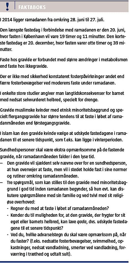 In Islam, the month of Ramadan is a period of fasting lasting 29 or 30 days. Epidemiological studies among Muslims in Denmark have not been conducted, but studies show, that fasting among pregnant Muslim women is common. Fasting does not increase the risk of growth restriction or preterm delivery, but there are reports of decreased foetal move-ments. Furthermore, the fasting may have long-term health consequences for the offspring, especially when they reach their middle age. According to Islam and the interpretation, pregnant and breast-feeding women are allowed to postpone the fasting of the month of Ramadan to a later period.