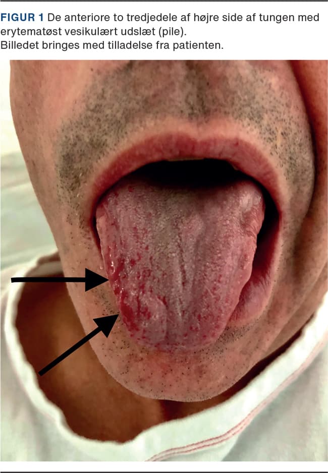 Øresmerterne blev beskrevet som konstante og beliggende dybt i højre øre. Hovedpinen var stillingsuafhængig, frontal og uden lateralisering. Patienten klagede over en sviende fornemmelse helt anteriort i tungen bl.a. ved indtag af væske. Objektivt var han afebril, ikke nakkestiv, havde blikretningsnystagmus mod venstre og tydelig højresidig perifer facialisparese med delvis involvering af panderynken. På den anterolaterale højre side af tungen blev der observeret vesikler, som ved kontakt med vatpinde medførte en sviende fornemmelse (Figur 1). Ved en otologisk undersøgelse bekræftedes ovenstående.