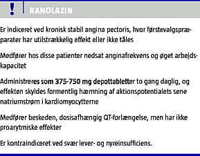 Kronisk stabil angina pectoris (KSA) forekommer hos ca. 4% af befolkningen (> 20% af alle over 75 år), og målene for behandlingen er at reducere symptomerne, modvirke sygdomsprogression og forbedre prognosen. Ud over modifikation af risikofaktorerne, dvs. rygestop, fedtfattig kost, motion og korrektion af overvægt, kontrol af hypertension og diabetes mv., bør patienterne oftest have trombocythæmmer (acetylsalicylsyre), kolesterolsænkende medicin (statiner), medikamentel antianginøs behandling og evt. angiotensinkonverterende enzymhæmmer, ligesom perkutan koronarintervention (PCI) eller koronar bypassoperation kommer på tale i udvalgte tilfælde. Den traditionelle antianginøse medicin, dvs. nitrater, betablokkere, calciumantagonister samt nyere præparater som nicorandil (kombineret nitrogen oxyd-donor og kaliumkanalåbner) og ivabradin (sinusknudehæmmer), øger myokardiets gennemblødning og reducerer dets iltbehov ved vasodilatation og modulering af hjertets frekvens og fyldnings- og tømningsbetingelser (pre - og afterload ). Ranolazin er et nyt antianginøst præparat med uafklaret virkningsmekanisme, der siden 2006 har været markedsført i USA til behandling af KSA, og som i juli 2008 blev godkendt til markedsføring i EU [1]. Præparatet er i EU alene godkendt til patienter med KSA, som ikke opnår effektiv symptomlindring med førstevalgspræparater, eller som ikke tåler disse.
