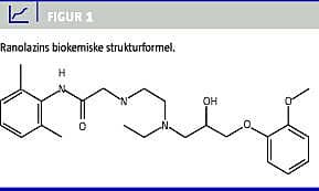 Ranolazin (N-[2,6-dimetylfenyl]-4[2-hydroxy-3-(2-metoxyfenoxy)-propyl]-1-piperazinacetamid-dihydroklorid, se Figur 1 ) blev patenteret i 1986 og er udviklet af CV Therapeutics (Palo Alto, CA, USA). Med depottabletter ses maksimal plasmakoncentration efter 1-6 timer, mens steady state opnås inden for tre dage [2]. Biotilgængeligheden er 35-50% og uafhængig af fødeindtagelse, ca. to tredjedele bindes til plasmaproteiner, og fordelingsvolumenet er 85-180 l. Efter administration af radioaktivt mærket ranolazin udskilles ca. tre fjerdedele af radioaktiviteten i urinen og ca. en fjerdedel i fæces, men kun ca. 5% udskilles uomdannet, og præparatet metaboliseres ekstensivt via leverens cytokrom P450 (CYP)-system, primært CYP3A4 og i mindre grad CYP2D6 [2]. Der er ikke kønsforskelle i de farmakologiske parametre, som heller ikke påvirkes af patientens alder i sig selv. Clearance af ranolazin er dog nedsat ved nyre- og leversvigt, og arealet under koncentrationskurven er op til to gange større ved svær nyreinsufficiens eller moderat nedsat leverfunktion, mens der ikke foreligger data for patienter i dialyse eller ved svært leversvigt [1, 2].