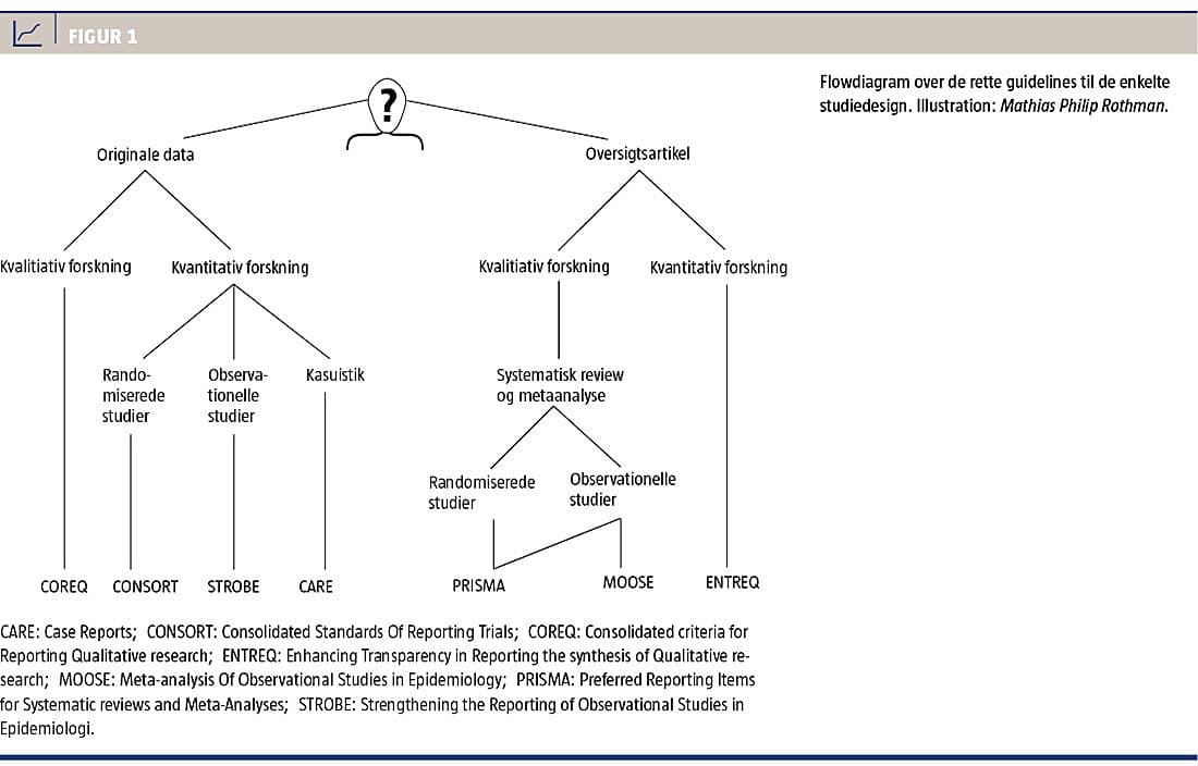 Enhancing the QUAlity and Transparency Of health Research (EQUATOR) network er et internationalt initiativ, som officielt blev lanceret i juni 2008 med målsætningen om at gøre rapporteringen af videnskabelig forskning mere transparent og præcis [4]. De eksisterende og nye rapporteringsguidelines publiceres ofte i anerkendte tidsskrifter [5-7], hvorefter de samles på EQUATORs hjemmeside (www.equator-network.org). Guidelines organiseres efter studietype og emne, så man ved hjælp af en søgefunktion hurtigt kan finde relevante guidelines. I skrivende stund findes der 224 forskellige guidelines på EQUATOR [4]. Vi har valgt kort at gennemgå de generiske guidelines (Figur 1) for afrapportering af studier, men henviser til EQUATORs hjemmeside for det fulde overblik over de forskellige guidelines.