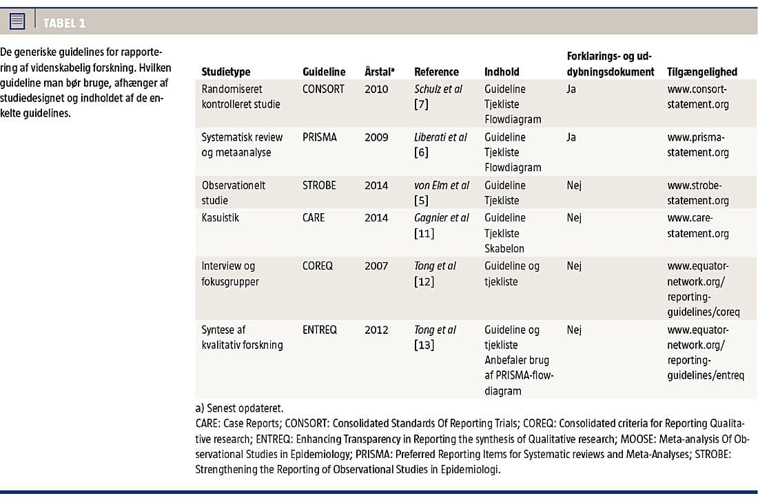 Ifølge Hensinki-deklarationen har man som forsker en etisk forpligtelse til at beskrive negative såvel som positive resultater så nøjagtigt som muligt, hvilket brug af guidelines kan bidrage til [3]. Formålet med denne artikel er at gennemgå generiske guidelines for rapportering af videnskabelig forskning på tværs af specialer og skabe overblik over, hvilken guideline man bør bruge afhængig af studiedesignet. Guidelines for henholdsvis randomiserede studier, systematiske review, observationelle studier, kasuistikker, interview og syntese af kvalitative studier gennemgås.