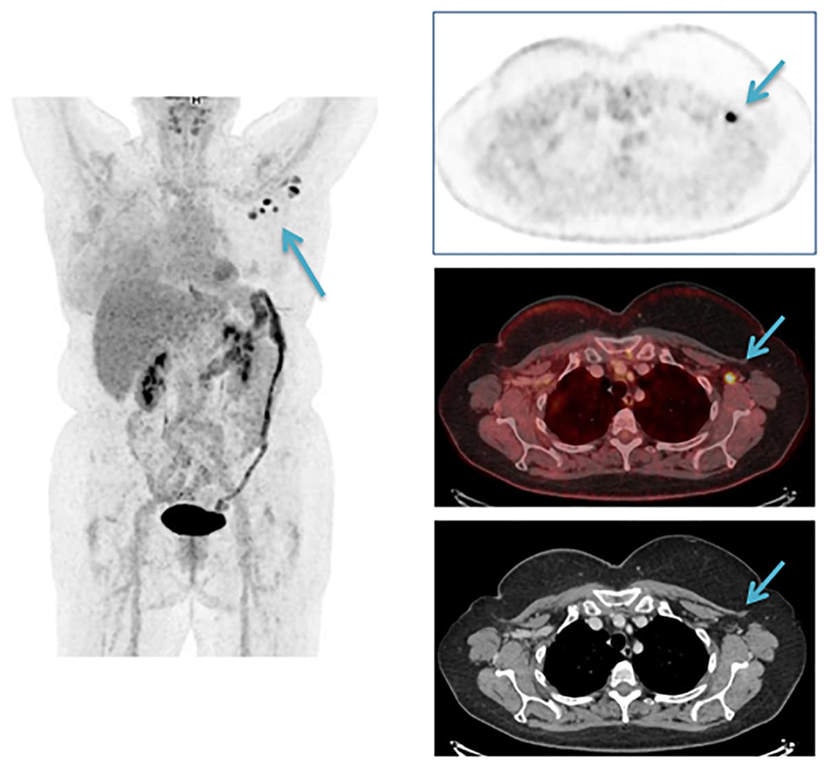 Reaktive lymfeknuder efter vaccination er velkendt [1] og også beskrevet som bivirkninger af vaccination mod COVID-19, herunder med vaccinen fra Pfizer BioNTech [2], men kan give anledning til differentialdiagnostiske overvejelser, særligt ved tolkning af 18F-FDG-PET/CT-billeder [3-5] hos patienter, der tidligere har haft cancer mammae, lymfom og malignt melanom.