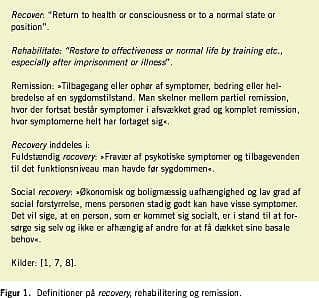 Helbredes man med recovery og ved rehabilitering? Ved helbredelse forstås, at sygdommen forsvinder, og dermed bliver diskussionen mere kompliceret. For hvad er sygdom? Helt overordnet er sygdom en unormal tilstand i kroppen eller sindet, som medfører, at man ikke har det godt [10]. Sagt med mere lægelige termer har personen en defekt i kroppen (ved psykiatriske sygdomme: en defekt i hjernen), der medfører, at personen har en række symptomer, der oftest betyder, at vedkommende har et nedsat funktionsniveau (har et handicap). Læger har en langvarig tradition for at ønske at definere sygdomme ud fra ætiologien, dvs. det, der er eller medfører defekt(erne) i kroppen, men ofte kommer man til kort. Vi ved i dag, at de fleste psykiatriske sygdomme har en multifaktoriel ætiologi, hvilket gør ønsket endnu mere kompliceret. Sygdomme beskrives derfor oftest ud fra symptombilledet. En sygdom er sjældent karakteriseret ved et bestemt eller flere altid forekommend e symptomer. Ved en sygdom er der en række symptomer, der optræder sammen; men ikke nødvendigvis på en entydig måde. Hos visse patienter med en given sygdom optræder en kombination af symptomer, hos andre en anden kombination. Læger anvender derfor et praksisbegreb om sygdom. Man behersker praktiske procedurer og rutiner til at diagnosticere, hvilken sygdom den enkelte syge person har ud fra det symptombillede, der præsenteres [11]. Ved helbredelse forstås som sagt, at sygdomme forsvinder, og det betyder helt optimalt, at defekten forsvinder eller repareres. Det er misvisende at tale om helbredelse ved de fleste kroniske sygdomme, hvor vi enten ikke kender defekterne eller ikke (endnu) kan udbedre dem, og hvor vi som følger deraf primært behandler symptomer. I stedet for helbredelse taler vi om remission (Figur 1). Ligesom ved remission beskriver man inden for recovery -begrebet, at der kan forekomme fuldstændig og delvis recovery . Definitioner på disse ses i Figur 1. Man kan heraf uddrage, at man hverken ved recovery eller ved rehabilitering kan tale om helbredelse. Ved fuldstændig recovery kommer personen sig over sygdommen ved, at vedkommende ikke længere har symptomer på sygdommen og heller ikke har funktionstab. Målet med rehabilitering er, at personen skal blive symptomfri og uden funktionstab.