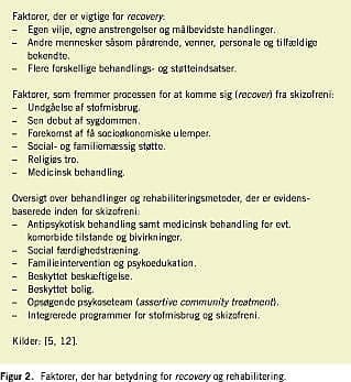 I Figur 2 ses en liste over faktorer, der er vigtige for recovery , og faktorer, der fremmer processen, samt en oversigt over, hvilke behandlinger og rehabiliteringsmetoder der er evidensbaseret i forbindelse med skizofreni. Som det fremgår af denne oversigt, har behandling og rehabiliteringsprogrammer en vigtig plads i recovery -processen. Som læge skal man dog samtidig gøre sig klart, at der er andre elementer, som er betydningsfulde, når en person skal komme sig af en psykisk sygdom. En hæmmende faktor for at komme sig har vist sig at være stigmatisering og diskrimination [1]. Psykiatere medvirker formentlig utilsigtet til at stigmatisere personer med psykiske sygdomme, idet man på de psykiatriske afdelinger hovedsagelig ser de mest syge patienter. Dette fænomen kaldes i epidemiologien for »klinikerens illusion«, da det farver klinikerens syn på invalideringsgrad og prognose [13]. Lægen kan på den baggrund bevidst eller ubevidst støtte den syge i at tilpasse sig en tilværelse som kronisk patient.