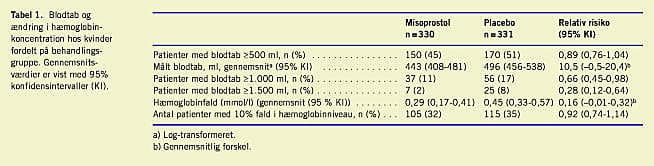 Ud af de 661 kvinder havde 150 (45%) i misoprostolgruppen og 170 (51%) i kontrolgruppen et blodtab på ≥500 ml, relativ risiko 0,89 (0,76-1,04). Det gennemsnitlige blodtab var 10,5% (-0,5-20,4%) mindre i misoprostolgruppen end i kontrolgruppen. Signifikant færre kvinder i misoprostolgruppen (11%) havde alvorlig post partum-blødning med et blodtab på ≥1.000 ml (11% vs. 17%; 0,66 (0,45-0,98)). For blodtab ≥1.500 ml var den relative risiko mellem misoprostolgruppen (2%) og kontrolgruppen (8%) 0, 28 (0,12-0,64). Forskelle i hæmoglobinkoncentration ved indlæggelse og et døgn efter fødslen varierede meget (Tabel 1); hos 33% (218 ud af 661) af kvinderne steg den. Det gennemsnitlige fald i hæmoglobinkoncentration var 0,16 mmol/l (-0,01-0,32 mmol/l) lavere i misoprostolgruppen end i placebogruppen.
