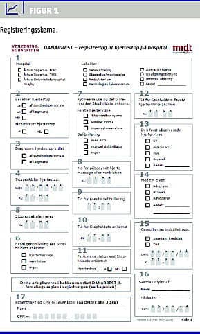 Den primære registrering blev foretaget af den behandlingsansvarlige læge prospektivt, dvs. umiddelbart efter hændelsen, på et skema (Figur 1 ), der var udarbejdet i henhold til Utsteinkriterierne for registrering af hjertestop [5]. De udfyldte skemaer blev opsamlet på prædefinerede steder på de tre matrikler, og oplysningerne fra skemaerne blev herefter indtastet i Klinisk MåleSystem, et webbaseret dataindberetningsværktøj.