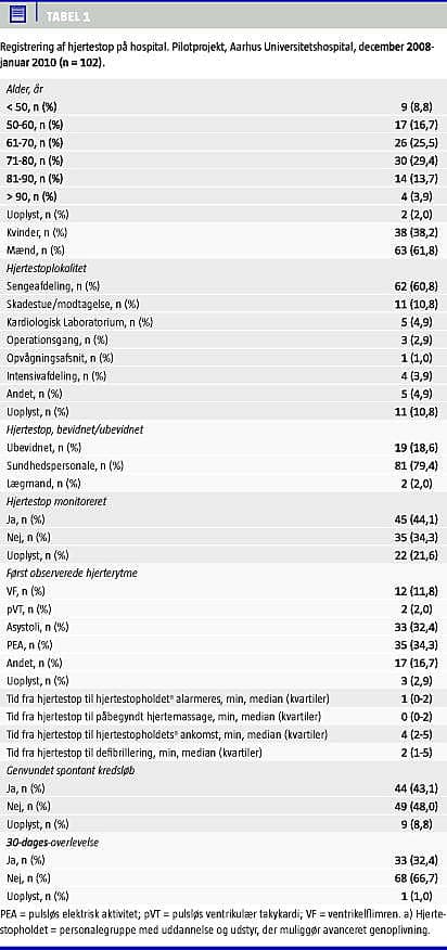 Der blev i perioden fra december 2008 til januar 2010 prospektivt registreret 102 patienter. Det totale antal registrerede hjertestopopkald på de tre hospitalers alarmcentraler i perioden fra februar 2009 til januar 2010 var 311.