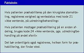 Hvis patienten præhabiliteres på den kirurgiske stamafdeling, skal man på den kirurgiske afdeling registrere ventestatus i den pågældende periode med kode 21 »ikke ventende, på udredning/behandling«. Her bør man på den kirurgiske afdeling selv registrere, hvilken form for præhabilitering der finder sted - ligeledes ved brug af de enkle forebyggelseskoder (Tabel 1A + B).