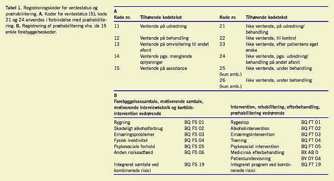 Hvis patienten modtager præhabilitering på en anden afdeling, skal den kirurgiske stamafdeling registrere ventestatus i den pågældende periode med kode 24 »ikke ventende, pga. udredning/behandling på andet afsnit«. Den anden afdeling bør så registrere, hvilken form for præhabilitering der finder sted. Dette gøres hurtigst med de 15 enkle forebyggelseskoder [5] (Tabel 1B ). Disse koder er fundet at være forståelige, anvendelige og dækkende af både medicinske og kirurgiske specialister, såvel nationalt som internationalt [6, 7].