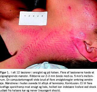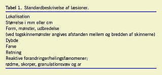 Patienten undersøges afklædt. En detaljeret beskrivelse af læsionerne i huden foretages, idet lokalisation, størrelse, form, dybde, farve, retning og reaktive forandringer beskrives (Tabel 1). Alle læsioner såvel ældre som friske nummereres på figurtegningen og beskrives. Der tages et foto vinkelret på læsionerne med målestok og identifikationsnummer til dokumentation af læsioner og til brug ved eventuel senere retsmedicinsk vurdering.
