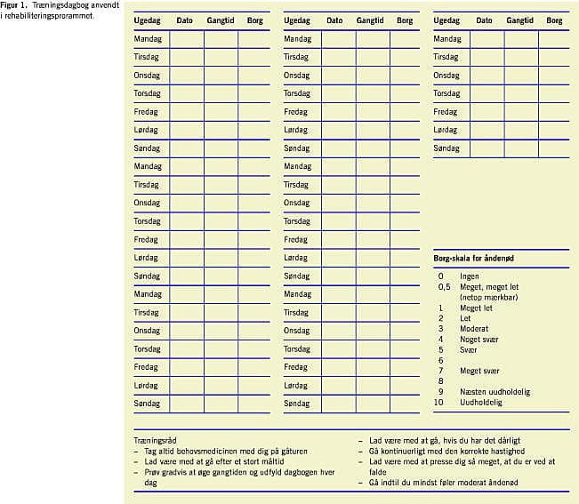 Forud for indgang i rehabiliteringsprogrammet blev patienten indkaldt til en ambulant undersøgelse og informeret om principperne i træningsprogrammet. Ved hjælp af en specielt designede gangtest blev der gennemført måling af den maksimale iltoptagelse, og træningsintensiteten blev fastlagt, så patienten skulle gangtræne med en intensitet, som svarer til ca. 85% af den maksimale iltoptagelse [7, 8]. Til sidst gennemførtes en udholdenhedsgangtest med netop denne intensitet. Gangtiden, det vil sige den tid, som patienten kunne gå med den givne hastighed, blev målt med et stopur - denne tid (Tid 1) dannede udgangspunkt for konditionstræningen. Alle patienter blev tilskyndet til at gangtræne hver dag og bruge et stopur og en træningsdagbog (Figur 1 ). Udgangspunktet for træningsvarigheden var den tid, som blev registreret i forbindelse med udholdenhedstesten (Tid 1). Patienten skulle gå med samme hastighed som under udholdenhedstesten og blev instrueret i, at gåturen for hver dag skulle vare lidt længere (patienten målte gangtiden med stopuret og registrerede graden af åndenød i henhold til den åndenødskala som er trykt på dagbogen (Borg-skala) (Figur 1). Træningssessionerne på hospitalet bestod af opvarmning, gangtræning og cykeltræning. De blev primært brugt til at lære patienterne den rigtige ganghastighed, og til at l ære dem at tackle den åndenød, som opstod i forbindelse med træningen. Efter afsluttet træningsprogram gennemførtes udholdenhedstesten igen, og den gangtid, som nu blev målt (Tid 2), blev sammenlignet med tiden, som patienten præsterede ved den initiale vurdering (Tid 1).