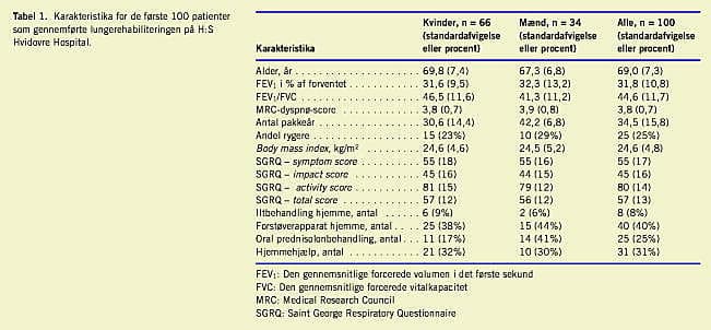 Karakteristika for de første 100 patienter, som gennemførte lungerehabiliterings-programmet, fremgår af (Tabel 1 ). FEV1 i procent af forventet værdi lå på ca. 32. Det vil sige, at det drejer sig om patienter med svær KOL. De fleste af patienterne var holdt op med at ryge inden indgangen i rehabili-teringen. Kun 8% af patienterne fik behandling med ilt i hjemmet, mens 40% brugte et forstøverapparat. Den initiale SGRQ-score lå på 57, hvilket er udtryk for ringe livskvalitet. I alt havde 46% af patienterne brug for transport til hospitalet. Signifikant flere mænd end kvinder var i vedvarende peroral prednisolonbehandling (p< 0,05), men ellers var der ikke nogle signifikante forskelle på de to køn.