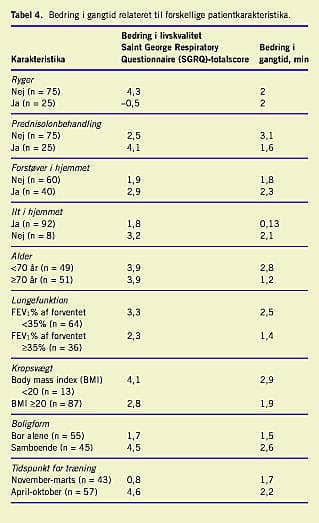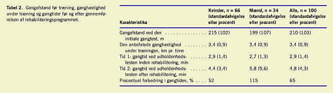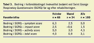 I Tabel 2 vises resultater af gangtræningen. Den anbefalede ganghastighed, svarende til 85% af den maksimale iltoptagelse, var ens for de to køn. I gennemsnit forbedrede mænd deres gangtid med 115%, mens forbedringen for kvinder kun var på 52%. Der var en signifikant forskel på de to køn (p< 0,05). Derimod var forbedring i den helbredsbetingede livskvalitet mere udtalt for kvinder, men forskellen var ikke statistisk signifikant (Tabel 3 ). Ikke overraskende observerede vi primært en bedring inden for de to domæner af SGRQ, som beskrev aktiviteter og symptomer. Der var ingen sikker sammenhæng mellem forbedringen i gangtesten og forbedringen i livskvaliteten - der var således patienter, som fik en udtalt forbedring i livskvaliteten uden at have bedret deres gangtest væsentligt (og omvendt).