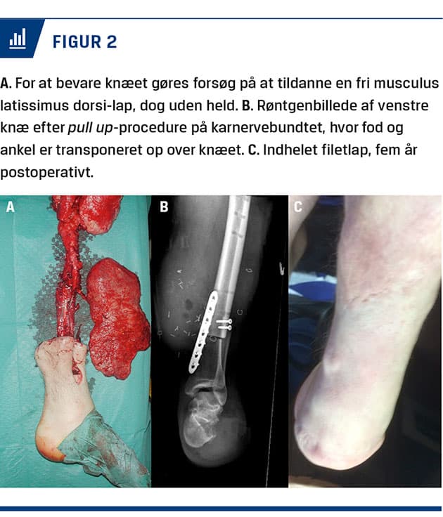 ø-lap fra foden. Lappen transponeres op over defekten på crus/knæ [18-20]. Karstilken kan baseres på det posteriore tibiale neurovaskulære bundt for at bevare sensibiliteten i lappen [20]. Denne type rekonstruktion kan medføre optimeret stumplængde og mulighed for senere protese (Figur 1 A, B, C og Figur 2