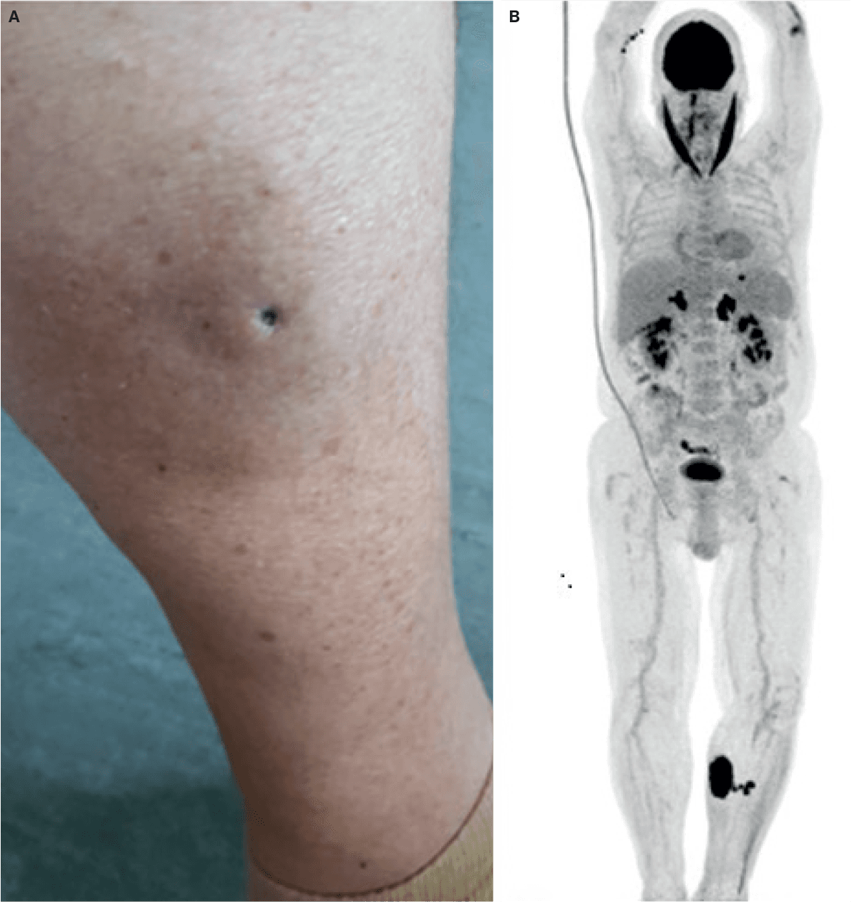 Klinisk sås et infiltreret, indureret og let erytematøst 10 × 10 cm-element på mediale crus og et tilsvarende mindre på laterale crus. Diagnostisk blev der overvejet panniculitis, og der blev taget en dyb 4-mm-stansebiopsi fra mediale crus, hvilket medførte en central sårdannelse (A). Histologien viste et højmalignt DLBCL med samme markørprofil som det tidligere CNS-lymfom. Før histologisvaret var modtaget, blev patienten indlagt akut i andet regi med tiltagende gangbesvær. Helkrops-18F-fluordeoxyglukose (FDG)-PET-CT viste høj FDG-optagelse i venstre crus (B), binyrer og colon transversum. MR-skanning af columna totalis viste myelitis som muligt paraneoplastisk fænomen. Diagnosen var ekstracerebralt recidiv af CNS-lymfom.