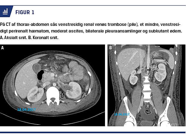 nyrebiopsi), moderat ascites, bilaterale pleuraansamlinger og subkutant ødem (Figur 1). Han blev samme dag overflyttet til et nyremedicinsk afsnit på et andet hospital til videre behandling. Her foretog man hverken trombolyse grundet en nybiopteret nyre og øget