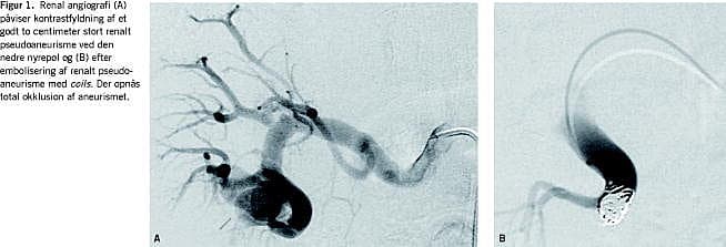 En 64-årig mand blev indlagt på grund af svær, behandlingskrævende arteriel hypertension og aftagende nyrefunktion. Isotoprenografi viste ikke tegn på afløbshindring, men gav mistanke om obstruktion af højre nyrearterie. Højresidig renal angiografi viste ingen nyrearteriestenose, men et to centimeter stort aneurisme i nedre nyrepol. Pseudoaneurismet blev superselektivt emboliseret med coils, hvorefter aneurismet var totalt okkluderet (Figur 1 ). Denne behandling påvirkede ikke patientens nyrefunktion.