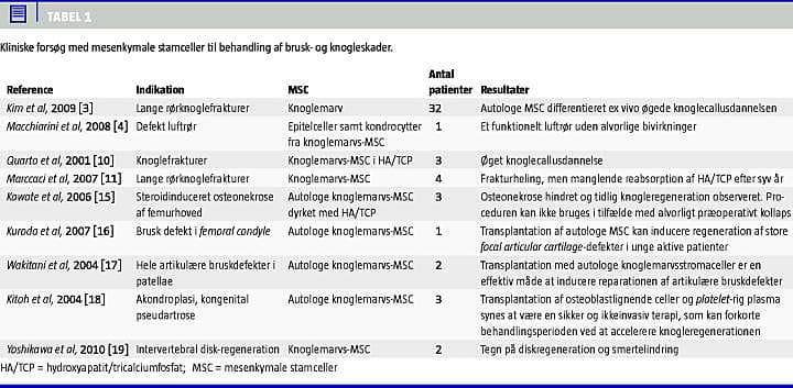 De mest nærliggende behandlingsmuligheder med hensyn til knogle- og bruskvæv er ikkesystemiske skader som for eksempel lokale brusk- og knoglelidelser og ikkehelende knoglebrud. Behandlingen af disse lokale skader er primært fokuseret på stamceller i kombination med forskellige biomaterialer. Mange af disse forsøg (Tabel 1 ) har fået en del opmærksomhed i pressen og skal kort beskrives her.