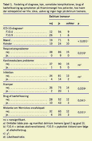 De parametre, der herefter blev undersøgt, var patientens køn, alder, indlæggelsens varighed, alkoholpromille, kumuleret phenobarbitaldosis, krampeadfærd, om der var anvendt bæltefiksering, og om der var somatiske komplikationer i form af infektion, respirationsproblemer eller kardiovaskulære problemer. Såfremt der i journalen var anført mistanke om Wernickes encefalopati, eller vi ved vores gennemgang fandt, at der på indlæggelsestidspunktet var mindst et af følgende symptomer: nystagmus, bredsporet ataktisk gang, øjenmuskelparese eller kognitive forstyrrelser som tidsmæssigt kunne adskilles fra den delirøse reaktion, blev dette registreret som »mistanke om Wernicke« [8].