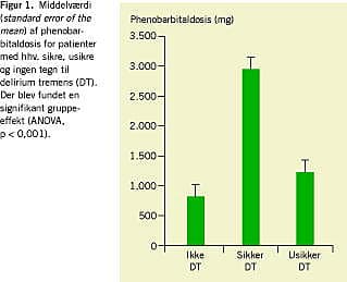 I Kramp & Rafaelsens undersøgelse af barbital- og diazepambehandling ved DT stilede man mod at bringe patienterne i en let sederet tilstand inden for tre timer [9]. Middeltiden til søvn i barbitalgruppen var otte timer, og patienterne fik i gennemsnit 4.500 mg barbital svarende til 1.800 mg phenobarbital (200 mg phenobarbital er ækvipotent med 500 mg barbital og 20 mg diazepam [9, 10]).