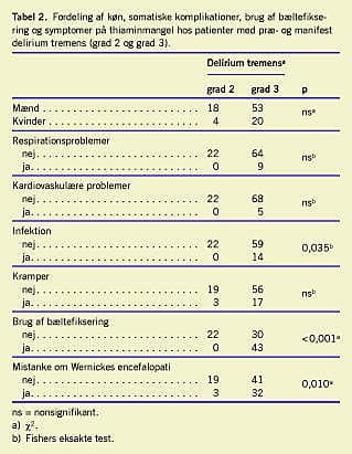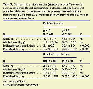 Af de 95 patienter med DT var der 22 med grad 2 og 73 med grad 3. Som det fremgår af Tabel 2 og Tabel 3 , var der signifikant højere forekomst af infektion og bæltefiksering, hyppigere mistanke om Wernickes encefalopati, længere indlæggelsesvarighed og højere gennemsnitlig kumuleret phenobarbitaldosis i gruppen af patienter med fuldt udviklet DT.