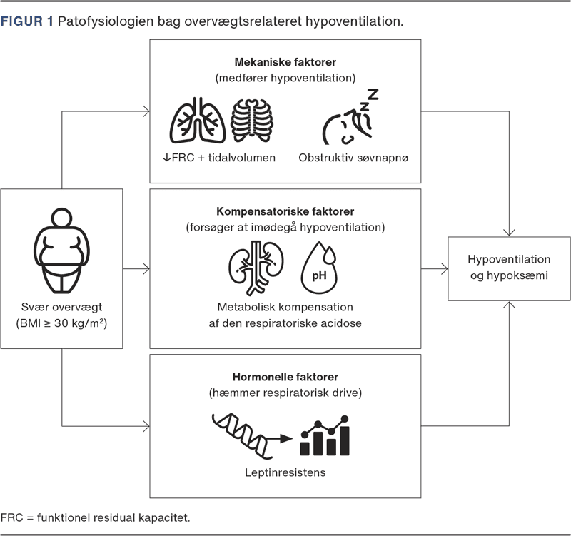 Adipositas øger det intraabdominale og intratorakale tryk, begrænser mobilitet af diafragma og thorax samt øger det respiratoriske arbejde [13]. Det medfører nedsat tidalvolumen, nedsat funktionel residualkapacitet, atelektasedannelse og ventilations-/perfusions-(V/Q)-mismatch. Den mekaniske belastning af svær overvægt kan medføre udtrættede respirationsmuskler og deraf udvikling af hypoksæmi og hypoventilation med forværring under søvn, værst under rapid eye movement (REM)-søvn på grund af generel muskelhypotoni [14]. Fedtaflejringer i vævet omkring de øvre luftveje øger desuden risikoen for udvikling af OSA med yderligere hypoksæmi og fraktioneret søvn. Apnøer og hypopnøer medfører ændringer i blodets indhold af ilt og kuldioxid, hvilket aktiverer respirationscenteret i medulla oblongata, der udløser en arousal (mikrovækning), der skal genetablere normal vejrtrækning hos patienten.