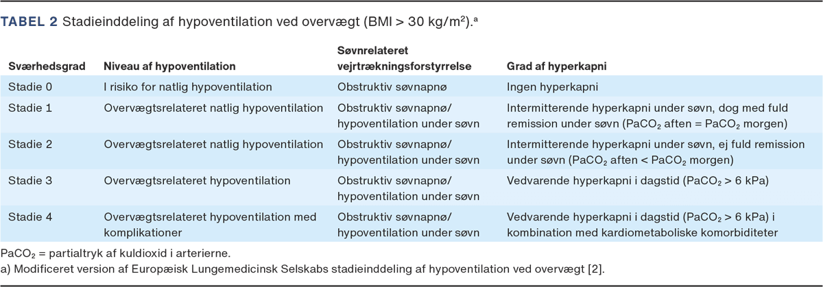 I klinisk praksis ses et kontinuum af fem stadier fra overvægt og obstruktiv søvnapnø (OSA) og/eller over intermitterende hypoventilation under søvn til kronisk respirationssvigt med kardiometabolisk komorbiditet (Tabel 2) [2]. Patienterne har også mange symptomer til fælles med patienter udelukkende med OSA. De hyppigste er dagstræthed, morgenhovedpine, koncentrations- og hukommelsesbesvær samt observeret snorken og pauser i vejrtrækning under søvn. Derudover har de større tendens til symptomer svarende til pulmonal hypertension og højresidigt hjertesvigt [3].