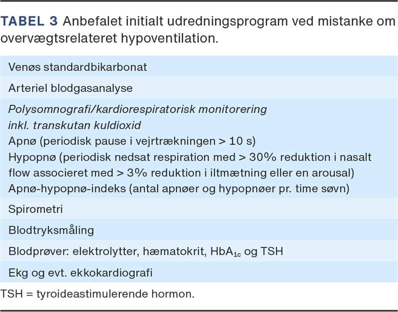 Diagnostikken har til formål at undersøge vejrtrækning under søvn (SDB), bekræfte alveolær hypoventilation, udelukke andre årsager hertil samt identificere komorbiditeter. Tabel 3 viser et samlet overblik over anbefalede undersøgelser.