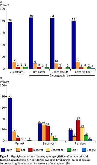 Summary Results four to seven years after laparoscopic fundoplication for gastro-oesophageal reflux disease Ugeskr Læger 2004;166:2992-2994 Introduction: The short-term results after laparoscopic fundoplication have been promising. We performed a survey four to seven years after laparoscopic antireflux surgery that included 90 of 100 patients eligible for a survey. They were sent a questionnaire with simple questions about their satisfaction with the surgical procedure, as well as the presence of gastro-oesophageal reflux disease (GORD)-related symptoms, side effects and complications. Materials and methods: Satisfaction with the surgical procedure was determined using a score of: 1. Very satisfied or acceptable; 2. Unacceptable; or 3. Uncertain. GORD-related symptoms and side effects were ranked in five grades of severity. Patients with persisting symptoms of GORD or symptoms indicating procedure-related problems were called in for an interview and offered a gastroscopy. Results: Eighty-six percent were satisfied with the results of the surgical procedure or considered it acceptable. Ninety percent had no or only occasional heartburn. 5% suffered regurgitation at night and at work and 6% after meals. Swallowing difficulties were a problem for 6%, who could eat only soft meals. Gas bloat and flatulence were major problems for 40% and 73%, respectively. Discussion: Laparoscopic fundoplication gives excellent control of GORD symptoms after four to seven years. 90% of patients have no or only occasional heartburn and 95% no acid regurgitation, and 86% remain satisfied with their decision to undergo surgery. Gas bloat and flatulence, however, are major problems, reported to be responsible for patients' regretting having had surgery. Patients with pathological reflux demonstrated by pH measurement preoperatively achieved the best symptom control and were most satisfied with the outcome. Demonstration of esophagitis by endoscopy had less convincing predictive value for a good result.