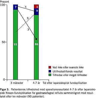 Laparoskopisk fundoplikation giver god reflukskontrol efter 4-7 år, idet 90% af patienterne var uden eller kun havde beskedne reflukssymptomer, og 86% var tilfredse med operationsresultatet. Morbiditeten var beskeden, men borborygmi og flatulens udgjorde dog et betydeligt problem, der ikke blev bedre gennem observationsperioden. Udvælgelse til operation bør inkludere døgn-pH-måling foruden gastroskopi.