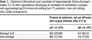 Hos 71 patienter blev der præoperativt foretaget såvel gastroskopi som 24-timers pH-måling. Sammenhængen mellem operationsresultatet og resultatet af disse præoperative undersøgelser ses i Tabel 1 . Der var signifikant flest patienter med pH < 4 i øsofagus i mere end 9% af døgnet, der var tilfredse med resultatet (p < 0,05). Påvisning af synlig øsofagit havde derimod ingen indflydelse på patienternes tilfredshed. Ti patienter blev opereret uden at have hverken synlig øsofagit eller pH < 4 i mere end 9% af døgnet. Fem af disse havde patologisk refluks enten om dagen eller om natten, tre havde enten lavt sphinctertryk, histologiske tegn på refluks eller et stort hiatushernie med smerter ved fødeindtagelse. En havde ikke haft refluksepisoder i det døgn, hvor pH-målingen foregik, men havde effekt af protonpumpehæmmer og ønskede derfor operationen, trods det manglende objektive holdepunkt for refluks. Patienten fortrød operationen.