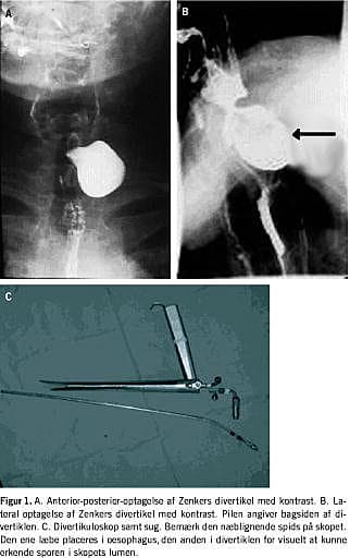 Behandlingen er kirurgisk og tidligere altid gennem åben lateral adgang på halsen, men nu oftest som endoskopisk behandling med enten laser eller stapleteknik. Den endoskopiske teknik er første gang beskrevet af Dohlmann et al [4]. Dohlmann anvendte en elektroslynge, men siden har flere nyere teknikker, heriblandt CO2 -laser, overtaget. Præoperativt sikres diagnosen ved, at der foretages røntgenundersøgelse af oesophagus. Man fremstiller både forfra og sideoptagelse efter indgift af barium kontast peroralt [3] (Figur 1A og B ). Størrelsen af divertiklet er af mindre betydning ved beslutningen om operation, hvis de ovennævnte symptomer er til stede, dog kan det være teknisk vanskeligt at behandle meget små divertikler endoskopisk, idet placeringen af divertikuloskopet vanskeliggøres af de små pladsforhold.