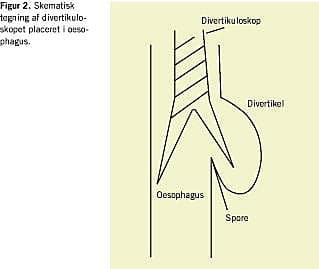 Proceduren indledes med rigid øsofagoskopi i generel anæstesi for at bedømme divertiklets størrelse og placering samt forholdene i oesophagus distalt for divertiklet. Herefter placeres divertikuloskopet (Figur 1 C) som vist i Figur 2 . Herefter placeres en våd svamp i oesophagus og sporen mellem oesophagus og divertikel brændes ned med CO2 -laser. Efterfølgende placeres det rigide øsofagoskop igen for at sikre fri passage.