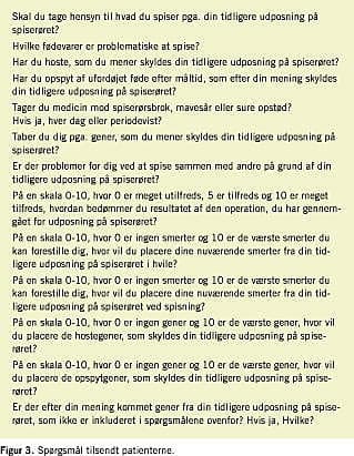 Resultaterne i opgørelsen er fremkommet dels ved en retrospektiv gennemgang af journaler, dels ved en spørgeskemaundersøgelse, hvor alle nulevende patienter fik tilsendt en række spørgsmål angående deres spiseevne (Figur 3 SPAN> ). Desuden blev patienterne bedt om at selvvurdere operationsresultatet ud fra en visuel analogskala bestående af fem delspørgsmål. Herefter er data analyseret ved hjælp af SPSS version 11 for Windows.